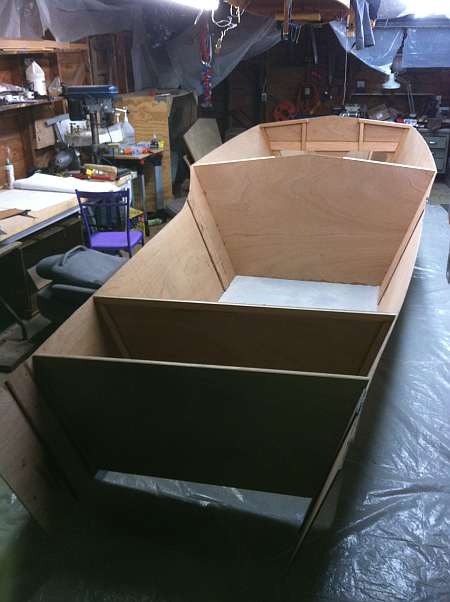 If your boat has a bottom skid/stiffener, now is the time to put it on. These parts aren't easy to install. Getting the joint between the bottom and the skid watertight is pretty important to avoid rot. Draw the location of the skid on the bottom and drill screw holes in the bottom about every 6". Apply a lot of thick glue or epoxy to the area of the joint and press the skid into position. Most likely you will have to hold it down temporarily with a few screws driven from the outside. Then crawl inside the project and install the screws from the inside through those holes you predrilled. Not much fun but you should be able to get a good straight installation with good glue squeeze out all along the skid. Remove the temporary screws that you drove from the outside in.