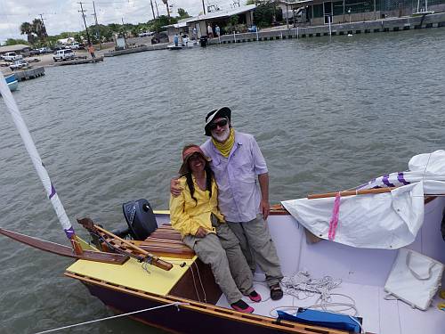 John took her out on a few short shakedown runs and then immediately into the Texas200 for which she was designed. He crewed for his wife Rosa. They camped in the boat at the stops. He reported no severe problems although he said she had stout weather helm until he rerigged the main further forward. Now, I drew the rig to balance well without the mizzen so this is not too much surprize, especially in the strong winds of the TX200 where the main is always reefed but the mizzen is not. To add to this I believe his mizzen is mounted on his new transom extension 18" aft of the original mizzen location which would add to the weather helm. But not to worry. These rigs are very easy to adjust and a quick and permanent fix, if needed, might be to adjust the rake of the mast by moving the mast partner, which simply bolts to the deck slot beam, forward as required. Anyway, that is how I look at it now. I would not be too quick to change it until I also sailed her in light winds since high winds almost always add to weather helm. Also, in the strong TX200 winds with the boat going hull speed all the time he found the sink weight in the rudder to be too small, with the result that the rudder would not hang vertically and instead would slant back a bit. That increases the helm forces which could be quite tiring given 40 mile legs of the TX200. So maybe the rudder could stand more lead, or maybe the sails adjusted to remove the helm force. Here are a few photos. You can see that the extra stern extension adds a lot to the boat.