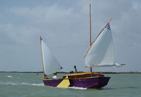 This is Ted Arkey's Jukebox2 down in Sydney. Shown with the "ketchooner" rig, featuring his own polytarp sails, that is shown on the plans. Should have a sailing report soon.