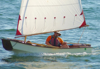 Update, 2012. John Goodman built the prototype. John is a very experienced builder and sailor which is a great thing for me. He found a few errors in the plans. The main flaw was in not allowing enough room between leeboard and hull with the result that the leeboard can at time bind against the widely flaring hull side. The simple fix was to make the leeboard guards wider. I fixed that on the drawings. There was another potential issue with the bevel given for the sides of the bow transom. John didn't agree with my number and supplied his own. I must admit I have rerun the space age rocket science vector analysis that I use to give the bevel and I keep getting the same wrong answer so I don't really know what to think. I have added John's bevel to the plans beside my own so you will have to assemble the parts enough to scope it out, never a bad idea anyway. There can be an explanation in this depending on where the bevel is measured.
