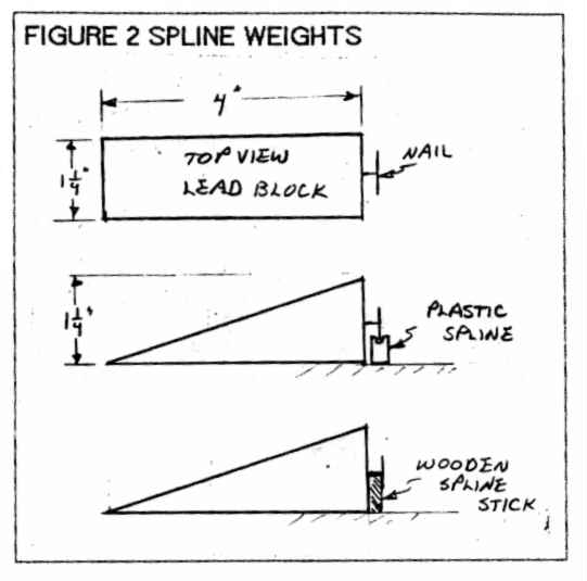 I made my own spline weights, being shocked at the price of the store bought weights (the plastic splines were shockingly cheap at the time at least). First I cast lead (old wheel weights work great) into blocks 4" x 1-1/4" x 1-1/4". Then I sawed the blocks across diagonally to give two triangular blocks. Then I drove a roofing nail into the fat end of each block so that it fell just right into the slot of the drafting spline as shown in figure 2. I wrapped the lead with paper tape to keep it from marking everything up and glued a rubber layer to its bottom for friction. Figure 2 also shows the set up used with the simple stick spline.