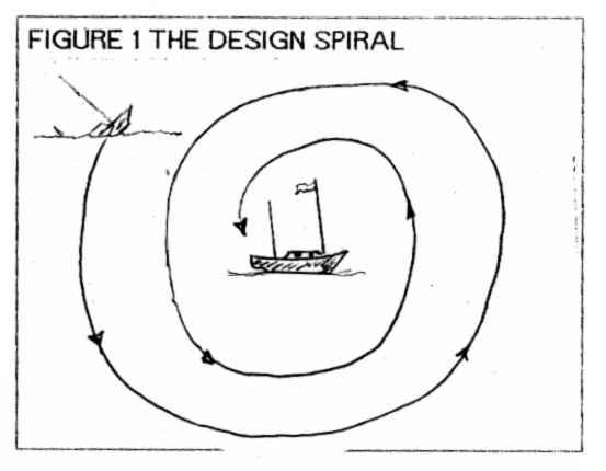 Design is almost always an iterative process. At the spiral's bullseye all the boat's elements are in harmony and the pieces of the puzzle all fit. But just as in solving a jigsaw puzzle, in design there is a lot of trial and error fitting involved. I think the best example of that is in sizing sail rigs. The amount of sail you can carry is dependent upon the stability of the hull so you might think that you could pick a proper sail area knowing the hull's stabiltiy. But the stability itself is greatly affected by the size of the sail rig and you must assume a rig size before calculating stability! So which came first, the chicken or the egg? It doesn't matter, but you've got to assume one comes first to get started. Then you proceed through the design process, checking calculated values of stability or sail rigs against assumed values, make adjustments, and move another step closer to the bullseye.