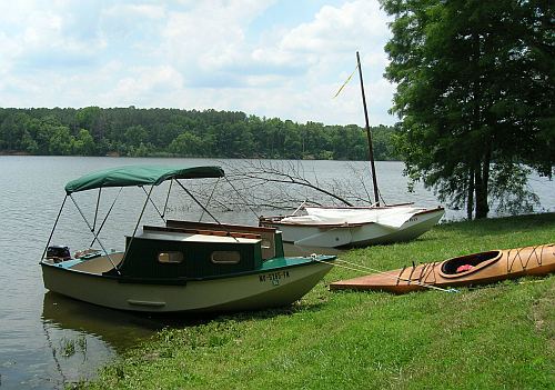 A bit down the line were these early arrivals. The power skiff is Paul Ellifrit's modified Family Skiff, now in its second season as a power skiff. These boats won't plane but Paul got by nicely with 5hp and served to tow a few folks back during the days. Up on the bank is the CLC Chesapeake of Paul Ellifrit The Younger. Beyond that is a new Family Skiff by Tim O'Gill. The lake was up full this year, right to the tippy top.