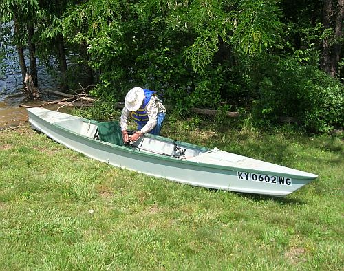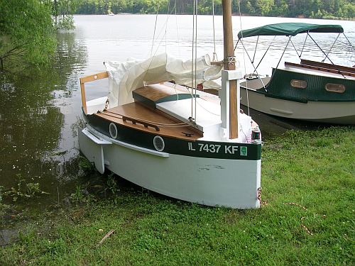 Here is Bob Hoffert's Toto in Ohio, maybe the first boat after mine. Looks like he has added a fore deck and put a big access hole in the aft bulkhead. (Remember that the aft storage box is also supposed to be an emergency buoyancy air box to help save your butt in a capsize.)