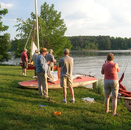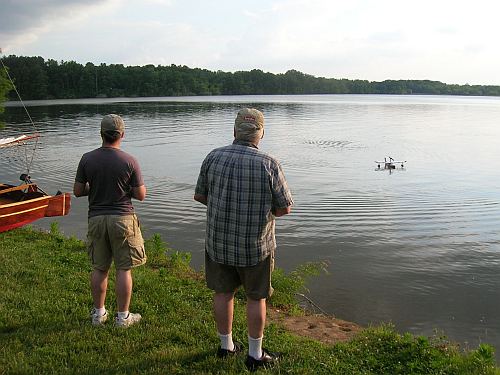 With the sun getting low the lake really became a millpond and Kilburn Adams, his son Michael, and Bill Dulin broke out the RC airplanes. Kilburn and Bill have Skiff Americas, designed by Kilburn. Michael has a veteran Bolger Teal that probably came to the very first messabout decades ago. But for now they gave an airshow...