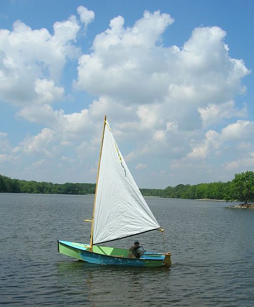 This is Gene Berry's boat from west Missouri. It is one of my Mayfly12 boats but with a difference. As he assembled the hull, had it upside down waiting its flat bottom, he decided to experiment with a V bottom. So he sculpted one so to speak by eye and did a fine job. Now, the winds were light after Friday morning so I took advantage of my boatless situation and gave this one a go. Lot's of fun. The boat surely floats on that V. It is tippier than a flattie and less comfortable, needing seats of some sort to keep your bottom from forever sliding to the bottom of the V. But it is smoother handling, quieter and faster I am pretty sure. And more involved to build, or course. I think Gene's rig here is right to the blueprint, leeboard and sharpie sprit sail. A bit more on this later.