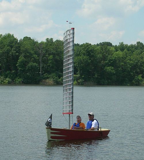 He says you can't carry it like that in any wind. These two fellows, who didn't stay until the sign up sheet went around so I don't know who they are, come every now and then with their Uncle John's Skiff fitted with some outrageous sail rigs. This year it had a rigid sail that slips over an aluminum tube mast and can turn in any direction. I think this was maybe the second trip out with it. They say the sail gives no clue as to the direction of the wind, as a soft sail can, and one must focus on the masthead vane. But alas,