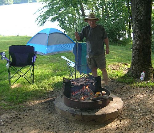 ...is cookout time. It is actually the only planned event of the weekend. About 4 we take a quick head count (usually about 40) and run down to Benton Walmart again for the basics. Other dishes appear like magic on the picnic table. Here is the head cook DC Brown at work...