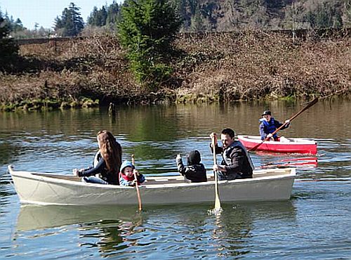 Andrew Linn, famed for burning his new Laguna on the beach after the Tx200, helps build boats at www.toledocommunityboathouse.com , including this QT power skiff shown here being used by a young family as a canoe. |