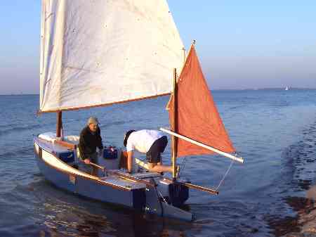 I should add that the little mizzen is Gary's addition and is quite valuable on a long cruise, and by my experience usually a bother for a short daysail. Although Gary has never used a motor on his Frolic2 he still retains the well and saw no need to change the offset rudder.
