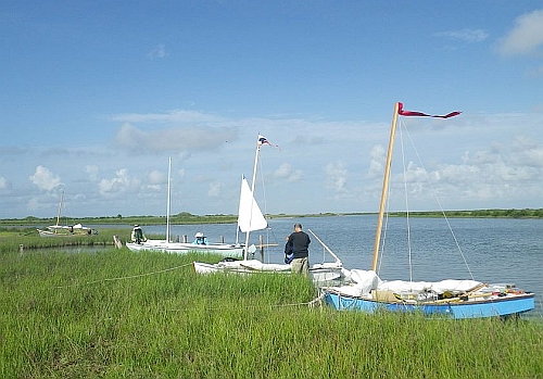 And the Vole in New York is Garth Battista's of www.breakawaybooks.com, printer of my book and Max's old outboard book and many other fine sports books. Beautiful job! Garth is using a small lug rig for sail, not the sharpie sprit sail shown on the plans, so I will continue to carry the design as a prototype boat. But he has used it extensively on his Bahamas trip towed behind his Cormorant. Sort of like having a compact car towed behind an RV.