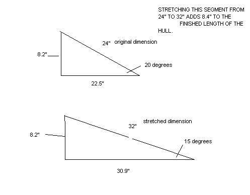 What you were thinking about was a hull length stretch there of 16/12 x 22.5" = 30". So it is there about .9" longer than expected because of the difference in bow angles (because we are just making it longer and not wider). There are twelve sets of side panel dimensions in this example but the above would be the worse case. I would expect a boat streched this way will end up a few inches longer than the expected 16'.
