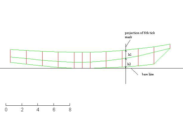 To get the true flat shape of the side panels you need to think in terms of peeling them off the boat and laying them flat. To do that you always need to draw a view of the boat that will show the proposed panel on edge. In our example let's use the top view to see the side panels on edge. (The side view shows the bottom panel on edge.) Here is how I used to do it. First get the edge view. Then "tick" the edge view at regular intervals, say every 12" in this case, like this: