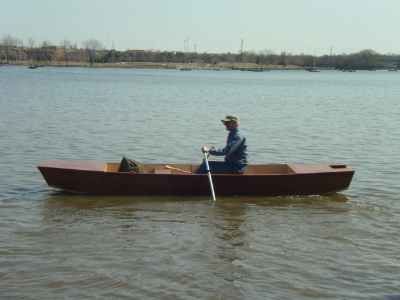 Jim Hauer built the prototype in Green Bay and sent these photos. I think it came out exactly as hoped. Remember, this is not really a rowing boat as much as a floating boat so the face forward rowing will be used more to steer than to propel. The photo of the man paddling in the stern shows that the aft transom is still up giving good flow lines there, unlike a square stern power jonboat. Under power Jim said that 2.5 hp is about all you can take, the boat not behaving well above that.