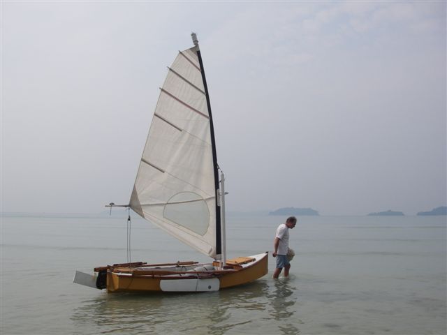 This is Ted Arkey's Jukebox2 down in Sydney. Shown with the "ketchooner" rig, featuring his own polytarp sails, that is shown on the plans. Should have a sailing report soon.